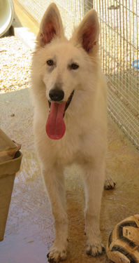C'est encore un chiot avec des comportements de chiot. Athi a été abandonné parce que son jeune maître ne pouvait plus s'occuper de lui, il vivait en appartement avec un autre petit chien. Athi ne connait pas grand chose de la vie, alors en arrivant chez nous l'apprentissage a été un peu accéléré. Tout d'un coup la nature, des copains et surtout Gaby le grandes zoreilles avec qui il joue beaucoup. Gaby est adorable de patience et de gentillesse avec Athi qui lui en fait voir de toutes les couleurs! Gaby nous a beaucoup aidées à gagner la confiance de Athi, qui était replié sur lui même à son arrivée, méfiant et inquiet. L'approcher n'était pas simple. Maintenant ça va beaucoup mieux, il vient volontiers chercher les friandises et sort dans le parc pour jouer à cache cache avec Gaby. Mais ce que Athi préfère par dessus tout c'est l'eau! Il ADORE l'eau, impossible d'utiliser un jet sans qu'il vienne y mettre sa gueule grande ouverte :) Depuis 10 ans, Athi est notre quatrième Berger Blanc Suisse, alors nous les connaissons un petit peu. Comme les autres il s’attache énormément aux humains. Il est très doux, de nature curieuse, attentif à ce que vous faites. Il est intelligent et comprend vite ec que l'on attend de lui pour peu que l'on sache le lui expliquer. Athi s'entend avec els autres chiens pour els chats on ne sait pas :)