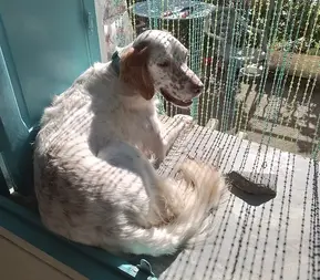 Gervaise et Norbert ne sont pas des inconnus, ils ont adopté Nisco le Setter en Mars 2019...Gervaise nous a appelées en voyant la bouille de Cookie : elle connait la race et le caractère des berger des Pyrénées pour en avoir déjà eu. Elle sait que Cookie comme sa chienne, a certains traits de caractère bien particuliers, ce que souvent les éducateurs canins ignorent ou sous estiment. Ce n'est pas par la contrainte qu'on avance avec un chien, et encore moins avec ce type de chien qui vous le fera savoir en envoyant les dents! Ils sont donc venus la rencontrer en connaissance de cause profitant du voyage pour amener Nisco que nous avons revu avec plaisir. Nous les avons prévenu de manipuler la belle avec précautions, c'est à dire de la laisser venir sans la forcer. Mais il y a des gens qui ont un don avec les chiens, c'est le cas de Gervaise et Norbert. Cookie s'est tout de suite plu avec eux. Se laissant grattouiller avec plaisir écartant Nox qui venait lui aussi chercher des caresses : la belle n'est pas partageuse! Nisco lui, s'est fermement fait rabrouer mais ils apprendront à devenir des amis, à partager les caresses de leurs maitres et le quotidien tout court. Cookie ne s'est pas faite prier pour monter dans la voiture, on n'a voulu pas tenter le diable alors Nisco est monté devant. En effet se retrouver à deux chiens dans un petit espace, quand on ne se connait pas, rien de tel pour déclencher une bagarre! Chacun a fait la route de son côté, depuis tout va bien, il parait que Cookie els suit comme une ombre, bon Nisco va devoir se faire au caractère bien trempée de cette jeunette un brin grognon mais ça ira! Merci à Gervaise et Norbert pour leur confiance renouvelée et de cette nouvelle vie qu'ils offrent à la belle Cookie !
