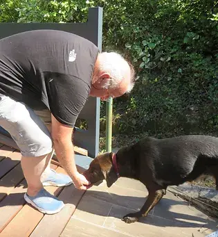 Dona fait partie des sept chiens que nous avions pris en charge il y a quelques semaines. Des chiens pour lesquels vous avez soutenu l'association, avec notamment des dons de croquettes. Une fois "remise sur pattes", identifiée, vaccinée etc...c'est la première à quitter la tribu. Il fallait bien que ça arrive, on ne peut pas laisser 7 chiens ensemble toute la vie. En fait Jean Marc nous avait contactées pour un autre chien, avec qui le contact fut difficile, voire inexistant, parce qu'il est peureux. Un long travail de sociabilisation était à prévoir...Alors nous lui avons proposé de rencontrer Dona. Un poil réservée, mais très à l'aise quand elle connait les gens. Jean Marc a tout de suite aimé Dona et inversement. C'est donc elle que nous avons amenée à la limite du Larzac, dans une maison en pleine nature avec un grand terrain dont Dona n'a pas fini de faire le tour! Plein d'endroits où se cacher, ou bien pour faire la sieste mais aussi que d'odeurs à renifler. Jean Marc est jeune retraité, il aime les balades et bricoler, alors la belle ne sera jamais seule ou rarement. elle accompagnera son maître partout. Et puis ses amis ont aussi des chiens; Dona ne manquera pas de copains, c'est important de continuer à sociabiliser son chien surtout quand il est "chien unique"! Dona devenue Choca a vite trouvé ses marques prés de Jean Marc qui est doux et patient. Nous leur souhaitons beaucoup de bonheur!