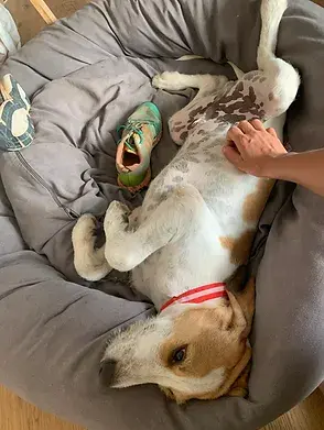 "!...) Un petit coucou pour vous dire que je suis bien, j’ai trouvé mes marques et même si je suis plus calme, je reste un grand joueur plein de vie. Promis je ne suis pas sdf, mais j'adore la bâche 🤣 Mais ce que je préfère avant tout , c'est d être collé à mes copains , une fois rentré d une grande balade (...)