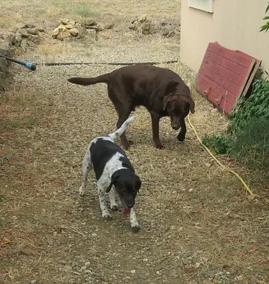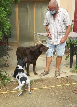 Cela faisait 7 mois que Gaïa était avec nous et nous désespérions de lui trouver sa famille. En effet pour les jeunes elle est trop vieille et pour les vieux elle est trop vive!!!! Elle avait été adoptée 48 heures et vite ramenée bien que les retraités aient été prévenus qu'elle était active et bien qu'ils l'aient baladée avec la famille d’accueil...les gens sont têtus :) ils n'écoutent pas. Nous avions donc récupéré notre puce à laquelle s'attachait Nadine et sa maman, Gus aussi sans doute. Et puis comme quoi il ne faut jamais désespérer, Thierry et sa femme Maria recherchaient un compagnon pour eux comme pour Légo, leur adorable Labrador. Thierry ne tenait pas spécialement à un jeune chien d'autant que Légo n'est plus tout jeune lui non plus. Comment vous dire que la rencontre avec Gaïa s'est bien passée, que le jour même Thierry nous rappelait pour l'adopter. Quelques jours plus tard Gaïa a donc découvert son nouvel environnement en pleine nature, avec la garrigue à perte de vue, un copain sympa et des coussins partout dans la maison pour les chiens, le BONHEUR! Ok il y a un petit bémol avec un chat sauvage qui squatte prés de la rivière et Gaia ne supporte pas les chats, ce sera à surveiller. Mais nous ne sommes pas inquiètes car Thierry travaille avec les chiens, en particulier pour le cavage c'est à dire la recherche de la truffe! Et il compte bien initier Gaia..A suivre sur la Doggy Family ! Un grand merci à Nadine qui a pris soin de Gaïa pendant ces longs mois car cela n'a aps toujours été simple. Merci à Mylène loin des yeux mais qui continue de nous suivre et qui a proposé à Thierry de regarder notre site et bien entendu merci à Maria et Thierry qui offrent à Gaïa sans doute les plus belles années de sa vie à venir avec eux.
