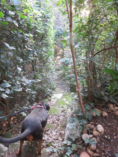 Une semaine plus tard nous partions avec Gigi pour une longue route afin de l'installer dans sa nouvelle maison à plus de deux heures de chez nous. A l'arrivée nous avons fait le tour du grand jardin à flanc de colline, un rêve de chien avec des buissons et des bosquets pour farfouiller. Sans compter les poules du voisin qui ont intrigué Gigi.