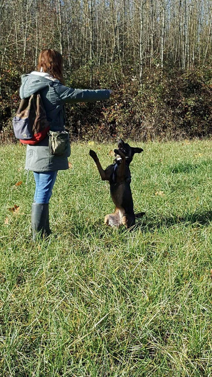 Héloïse et Lucci vont devenir éducateurs canins en méthode positive. Héloïse est en brevet professionnel éducateur canin à l'école de Cibeins (méthode positive), c'est une formation à plein temps qui dure 10 mois lors de laquelle elle doit valider ses examens avec Lucci pour avoir le diplôme. Il faut savoir que Lucci a beaucoup de mérite sur cette formation parce qu'elle y est rentrée en tant que chien réactif aux humains, pourtant hier, elle est passée en épreuve comme tous les autres chiens tellement elle a progressé (donc passage de l'épreuve au milieu d'un lycée avec du monde, etc…) A la première épreuve elles ont obtenu 9,5/10 !! L’épreuve consistait en 4 tours ludiques (pour Lucci c'était "tourne", "fais la belle" "tchek" "pan t'es mort"); à faire 50m marche au pied avec un passage de porte (assis devant, assis derrière) en donnant un ordre vocal OU gestuelEnsuite :- rappel à 20m avec quelqu'un qui lui propose de la nourriture- assis, debout, coucher, avec ordre vocal OU gestuel- et ensuite un rappel après qu'elle ait vu un chien inconnu (donc qu'elle revienne vers Héloïse avant d'y aller)- et un rappel pendant une interaction avec un autre chien- et un dernier point de motivation« Elle a été exceptionnelle, je suis vraiment très fière d'elle !! Maintenant c'est à moi d'assurer les prochains mois sur les examens écrits et oraux !! Merci encore de m'avoir permis de rencontrer Lucci, elle a changé ma vie et c'est que du bonheur !! »