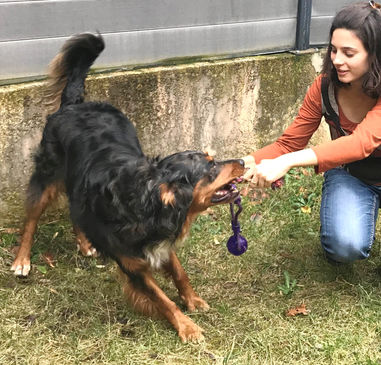 Eh oui le mélange Border Collie et Berger Australien c'est le top. Cela donne un chien à l'écoute, qui aime apprendre, doux, très joueur et intelligent. Cet adorable loulou s'entend avec ses congénères, au fur et à mesure des balades, il est de plus en plus à l'aise avec eux. Il y a encore du travail car il reste très excité et ne sait pas bien se présenter. En effet, Il veut jouer mais il est encore un peu maladroit et pataud, un peu comme un chiot de 30 kg !