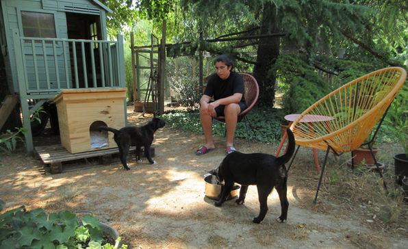 Après une longue route ils ont découvert le jardin avec curiosité, en particulier le point d'eau avec les poissons et les grenouilles. Il y a plein de coins et recoins pour se cacher ou dormir à l'ombre des arbres : le bonheur!