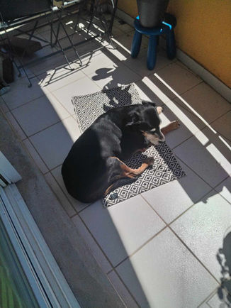 Nous sortons, voyageons... je n'avais jamais vu ça a son âge Je me prépare mentalement à la fin, je fais des bilans sanguins de temps en temps, et RAS, les vétos n'en reviennent pas, elle reste parfaite. Sa vue et son ouïe se sont beaucoup détériorées, mais on communique au toucher, l'effleurer en balade ; aux claquements de doigts, tapant des mains, ou même claquant mes chaussures sur le sol.