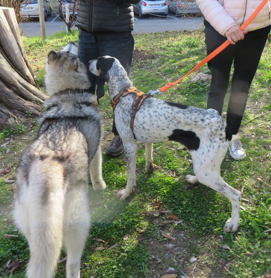 Quand nous sommes arrivées Lota n'était pas fière, les bruits de la ville ne lui étant pas familiers. Mais la présence de Sully l'a beaucoup aidée. Nous avons longuement fait le tour des jardins de la résidence avec Sully pour guide, puis il a bien fallu monter et prendre l'ascenseur... Une fois dans l'appartement Lota était surprise du bruit de ses pas sur le parquet, elle reniflait partout, curieuse. Les chats étaient enfermés dans une chambre nous els avons libérés. Ils sont habitués aux chiens. Nous ne savions pas comment Lota allait réagir...mais nous savons que els chiens de chasse ne chassent pas les chats! En général ils n'en n'ont jamais vu alors quand Lota les a vu débouler, elle a reculé pour se réfugier sur la terrasse! Finalement elle est allée délicatement les sentir...A part un coup de patte de bienvenue, ils ont bien réagi!