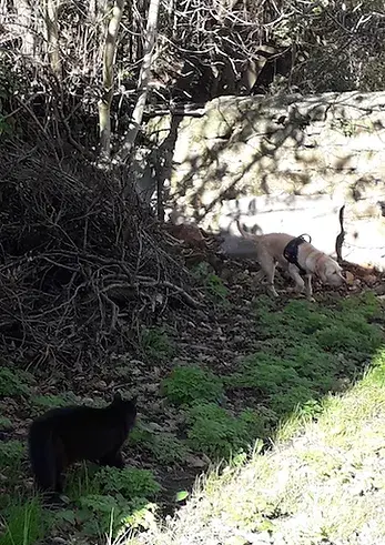 En balade, Lucy reste en longe, car elle aurait tendance à suivre ses instincts de chasseuse, on fait avec mais c'est dommage pour elle. Ce qui est surprenant, c'est qu'elle ne cherche jamais à fuguer du jardin, et pourtant, un tout petit grillage devant et un filet volailles sur le terrain à l'arrière ne devraient pas l'en empêcher. C'est tant mieux pour tout le monde, il faut croire que son territoire de quelques centaines de m2 lui suffit.