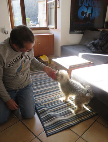 Trois semaines plus tard nous amenions Martin dans un petit village de la Vallée de l’Hérault. Il a retrouvé Floriane à qui il a fait des fêtes. Elle avait acheté des jouets à son attention qu’il s’est tout de suite approprié. Si Floriane travaille, ses horaires lui permettent d’avoir du temps pour prendre soin d’un chien. La pleine nature et la rivière sont à 5 minutes à pied de la maison….Les balades seront quotidiennes et Floriane compte bien le faire suivre partout ou presque. Martina rencontré le lapin de Floriane en toute sécurité et pour l’instant c’est la curiosité qui l’emporte.