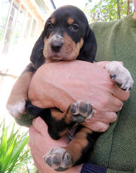 Type "joyeux mélange de St Hubert ? Beagle ? Bruno du Jura ?", femelle stérilisée, environ 12 mois.