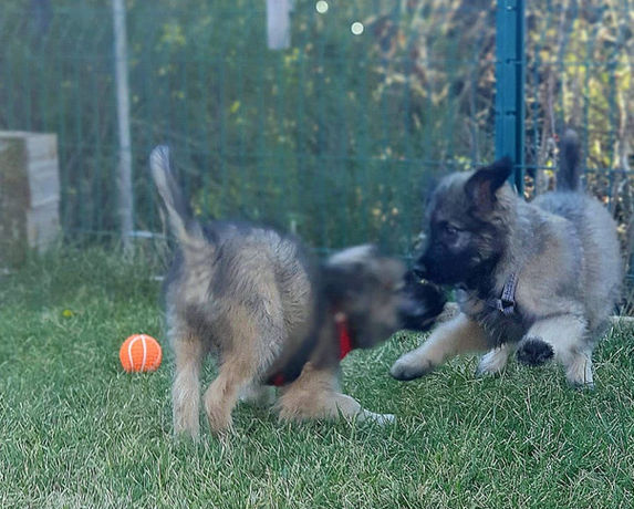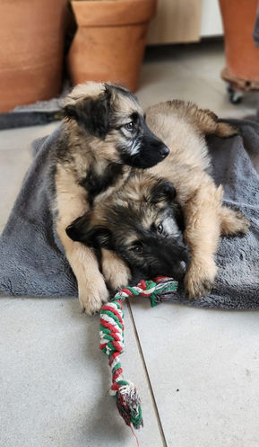 Eh oui petit à petit, parce que nous ne sommes jamais pressées, notre fratrie se disperse...Daphné a déjà deux chiens, un chien Spitz grognon d'un certain âge mais qui n'envoie pas les dents, et une chienne Beauceron jeune, joueuse en pleine forme...Elle recherchait un chien ni trop grand ni trop petit, entre ses deux chiens finalement, pour agrandir sa famille et surtout trouver un compagnon de jeu pour sa chienne. La rencontre avec Mowgli fut décisive.