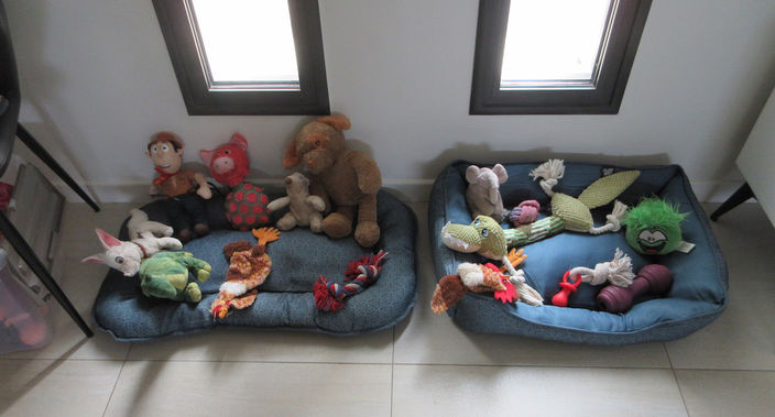 Après avoir fait le tour du jardin avec Némo et Bella, nous avons présenté tout le monde. Un peu sur la réserve au début, les trois chiens étaient curieux les uns des autres. Une fois à l'intérieur des paniers remplis de jouets les attendaient et c'est Némo qui. adonné le top départ du jeu, il ne s'arrêtait plus de courir un jouet dans la gueule tandis que Bella plus calme observait tranquillement.