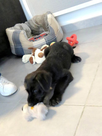 Comme TOUS les chiots, Naia joue beaucoup, elle a des petites dents très pointues qui font mal aux objets, mais aussi à la peau des enfants !