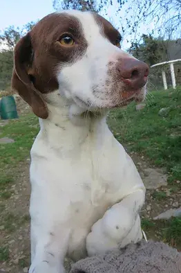 Ce fut pour nous une vraie surprise de découvrir sa bouille! En effet la fourrière nous avait contactées pour la prise en charge d'une chienne, la même que Doug mais en version fille! On avait donc une petite idée de ce à quoi elle ressemblait, et puis de fil en aiguille on nous a parlé de son copain de box...alors on a dit banco, on le prend aussi! Du coup si ne savait pas à quoi s'attendre, nous avons adoré sa bonne bouille! C'est un petit chien, un chouia plus petit qu'un épagneul, pourtant le véto a mis "croisé Braque Allemand" mais nous on le cherche encore le Braque Allemand! Polo n'en n'a ni la taille ni la couleur...Enfin voilà c'est le pote de Gaïa "la même que Doug en version fille", il est tout mimi, très affectueux limite pot de colle! Polo aime se caler bien contre vous, se faire grattouiller et ça pourrait durer des heures. Ce petit chien est aussi vif et joueur, il aime la compagnie des autres chiens mais pour les chats on ne sait pas. Comme c'est un petit gabarit, il est facile à faire suivre partout et devrait apprendre facilement les bonnes manières...sous réserve que vous soyez doux et patient. Polo fera le bonheur d'une famille avec ou sans enfants, un environnement proche de la nature sera plus adapté à ses besoins, même si nous n'avons aucun doute sur sa capacité à squatter le canapé..