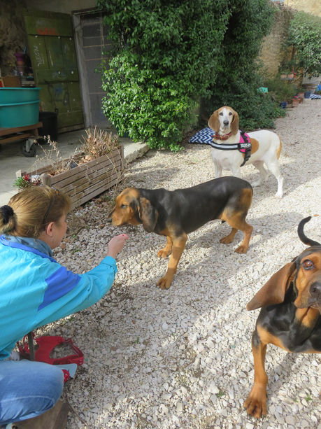 Nous avons déchargé les deux caisses de transport dans le jardin, pas question de prendre de risque, et refermé le portail… Prune et Léon ont exploré les lieux curieux, rencontré les deux chiennes de la maison et aperçu les chats, ah oui il y. aussi des chats. Nous ne connaissions pas leurs ententes, mais quand il s’agit de chiens de chasse c’est rare qu’il y ait un souci avec les chats…souvent ils en ont peur !