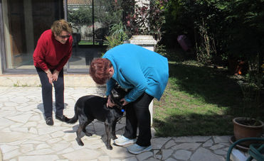 Lorsque Christine nous a contactées pour Monique, sa maman qui avait perdu son chie et qui souhaitait un nouveau compagnon, nous lui en avons proposé plusieurs. Parmi eux Rantanplan. En effet si nous pensions les faire adopter ensemble avec Nina, Alexandra leur famille d'accueil s'est vite rendu compte que l'on pouvait les séparer sans que cela soit un problème. Monique vit dans une maison avec un grand jardin et des poules. Elle est retraitée et son chien la suit partout...Si la première visite a été celle pour Rantanplan Monique a quand même souhaité rencontrer les autres chiens. C'était gentil de sa part...mais Rantanplan occupait déjà toutes ses pensées.
