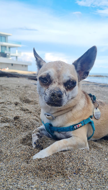 Il a beaucoup apprécié de courir, jouer et creuser des trous dans les plages de Bretagne, tellement qu'il en a eu des contractures musculaires sur ces petites cuisses. À la suite d’un passage chez le vétérinaire (parce qu'il m’a fait peur à ne plus se lever), on a un peu raccourci les sorties à la plage, le temps qu'il se muscle.