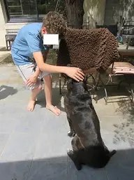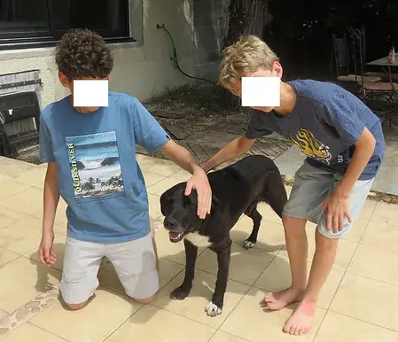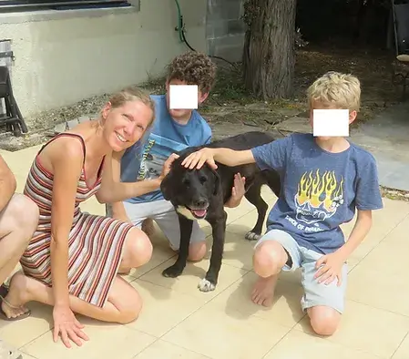 Contre toute attente et même si nous partons toujours "gagnantes" pour nos poilus, nous avons eu plusieurs appels pour Tom. Lui qui est resté si longtemps à la fourrière à attendre le bon vouloir d'une association, ne se doutait pas qu'autant de personnes pouvaient s'intéresser à lui. C'est vrai que les Labrador de couleur noire sont moins prisés que ceux de couleur sable, alors ils sont nombreux dans els associations tout comme les chats noirs. Estelle et son mari François ont eu un gros coup de cœur pour Tom, alors la première visite fut la bonne. Une maison de ville dans un quartier calme avec un grand jardin, de grands enfants toujours prêts à jouer avec lui ou le câliner, et puis Estelle travaille depuis chez elle : le bonheur pour un chien d'avoir un humain prés de lui souvent! Cette grande famille attendait avant de reprendre un chien d'avoir fait le deuil du précédent. Tom ne le remplacera pas, c'est une autre histoire qui commence. Les nouvelles sont bonnes : "(...) Quelques nouvelles de Tom après ses 10 premiers jours chez nous ! Il s'est senti tout de suite à l'aise avec nous, et il a très vite pris le rythme de la maison. Il nous suit à la trace partout dans la maison et le jardin, et c'est une vraie boîte à câlins, il en demande tout le temps !! Sa queue guérit bien, et ses points ont été retirés sans problème, même chez le vétérinaire il est resté incroyablement cool, on n'a jamais vu un chien aussi doux. Il adore aller se promener, c'est la fête à chaque fois qu'on lui met son harnais. Ce n'est pas un très grand sportif (nous avons fait hier matin notre première "grande" balade de plus d'une heure, il a adoré mais il est bien resté deux heures affalé par terre ensuite !), mais les promenades quotidiennes font son bonheur. Et pour le moment il a encore peur en voiture, mais il ne rechigne plus à monter dedans donc ça progresse vite. (...)"