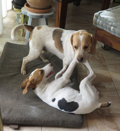 Pour accueillir Uka, Christophe était seul avec Roquette à qui il avait dit que bientôt il aurait une amie. Passées les formalités de bonjour, je te renifle et inversement, je te suis et inversement, nos deux poilus se sont mis à jouer, à se courir après, à celui qui irait le plus vite.