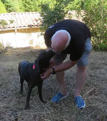 Dona fait partie des sept chiens que nous avions pris en charge il y a quelques semaines. Des chiens pour lesquels vous avez soutenu l'association, avec notamment des dons de croquettes. Une fois "remise sur pattes", identifiée, vaccinée etc...c'est la première à quitter la tribu. Il fallait bien que ça arrive, on ne peut pas laisser 7 chiens ensemble toute la vie. En fait Jean Marc nous avait contactées pour un autre chien, avec qui le contact fut difficile, voire inexistant, parce qu'il est peureux. Un long travail de sociabilisation était à prévoir...Alors nous lui avons proposé de rencontrer Dona. Un poil réservée, mais très à l'aise quand elle connait les gens. Jean Marc a tout de suite aimé Dona et inversement. C'est donc elle que nous avons amenée à la limite du Larzac, dans une maison en pleine nature avec un grand terrain dont Dona n'a pas fini de faire le tour! Plein d'endroits où se cacher, ou bien pour faire la sieste mais aussi que d'odeurs à renifler. Jean Marc est jeune retraité, il aime les balades et bricoler, alors la belle ne sera jamais seule ou rarement. elle accompagnera son maître partout. Et puis ses amis ont aussi des chiens; Dona ne manquera pas de copains, c'est important de continuer à sociabiliser son chien surtout quand il est "chien unique"! Dona devenue Choca a vite trouvé ses marques prés de Jean Marc qui est doux et patient. Nous leur souhaitons beaucoup de bonheur!