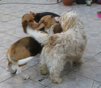 Un monsieur qui changeait de vie et d'environnement nous a appelées pour abandonner son chien. Il était un peu désespéré de ne pas trouver de solution à l'approche de son départ. Nous avons senti l'urgence de la situation et comme nous avons du mal à dire non, mais on tend à s'améliorer, nous lui avons donné RDV pour le récupérer. Il faut dire qu'il a eu de la chance, chez nous un chien adopté laisse toujours la place à un autre et une place venait justement de se libérer chez Adrianne. Le jour J rien ne s'est passé comme prévu, Hopi était supposé être identifié il ne l'était pas et comme il n'était pas question d'amener un chien en FA sans qu'il le soit, nous avons fait un crochet par le vétérianire et attendu notre tour entre deux patients, nous avons perdu un temps fou. Une fois enfin arrivés chez Adrianne et sa joyeuse troupe de chiens et de chats on a constaté que Hopi était OK chats!!!! Bon il faut dire qu'il n'en menait pas large vu le nombre et la taille des autres chiens. Nous l'avons tout de suite aimé ce chien avec sa grosse voix, ses pattes tordues, ses immenses zoreilles et son air malheureux, ah ça il sait faire. D'ailleurs il s'est vite intégré parmi les chiens d'Adrianne, comme dans le décor avec ses jolies couleurs, au point qu'elle a songé à le garder :) Une fois identifié restait à le faire stériliser, vacciner...Nous avions commencé à faire des photos quand une amie du propriétaire nous a contactées, elle a une chienne de la même race, avec Hopi ils se connaissent puisqu'elle le gardait quelquefois. Elle était à la fois furieuse et triste pour Hopi, son ami ne l'ayant pas tenu informée de son choix d'abandonner Hopi. L'idée a commencé à trotter dans sa tête qu'elle ne pouvait pas le laisser partir, nous avons bien discuté car elle a déjà plusieurs chiens et que même si elle vit à la campagne cela reste une charge, un chien de plus ce n'est pas rien. Nous avons laissé passer les fêtes et elle est revenue vers nous pour l'adopter! Quand nous lui avons amené Hopi il était triste de quitter Adrianne, ses nouveaux copains, nous aussi du coup de le voir ainsi...mais à l'arrivée quand il a retrouvé son ancienne bande, il était si heureux que tout était oublié. Il a couru partout dans le grand jardin, sauté sur les canapés et repris sa place avec son double, côte à côte comme si il n'était jamais parti! Tout est bien qui finit bien pour ce chien atypique si attachant. On aimerait que les nombreuses personnes qui nous appellent chaque jour pour abandonner leur chien aient une amie comme ça....Un grand merci à Adrianne et toute la bande pour avoir pris soin de Hopi.